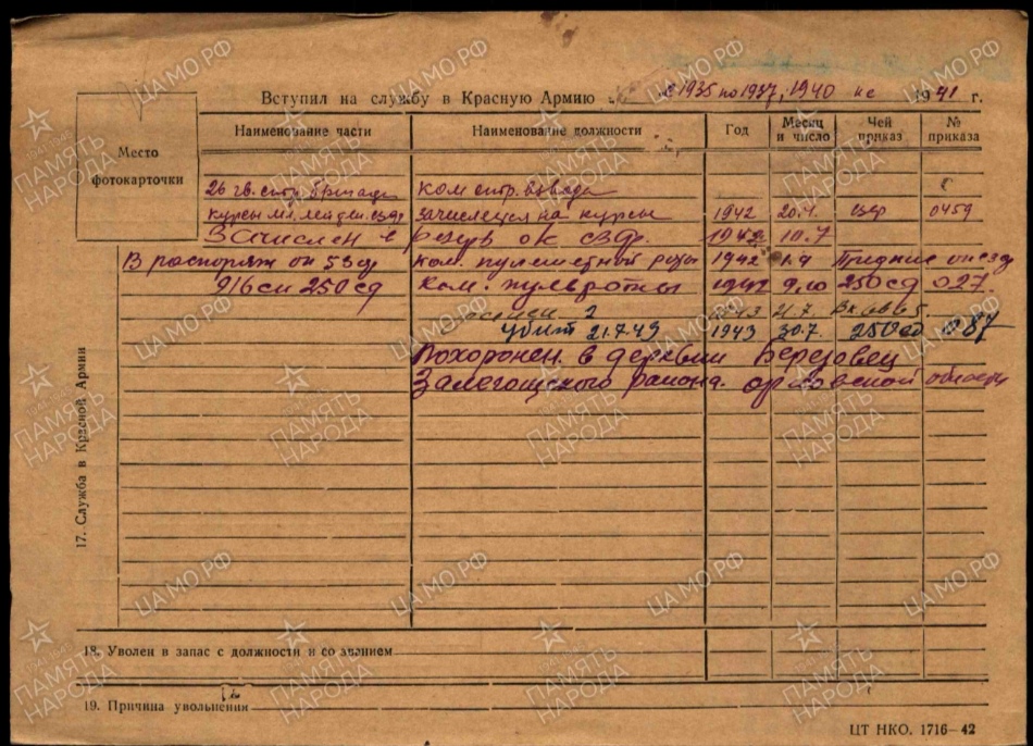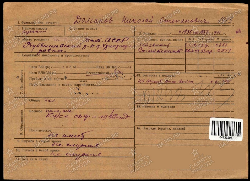 Место призыва: Куйбышевский РВК, Татарская АССР, Куйбышевский р-н