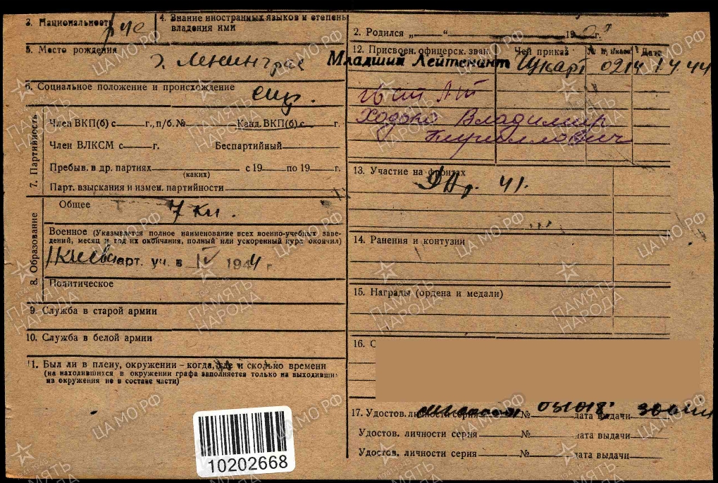 Дата и место призыва Ленинградский ОВК, Ленинградская обл.