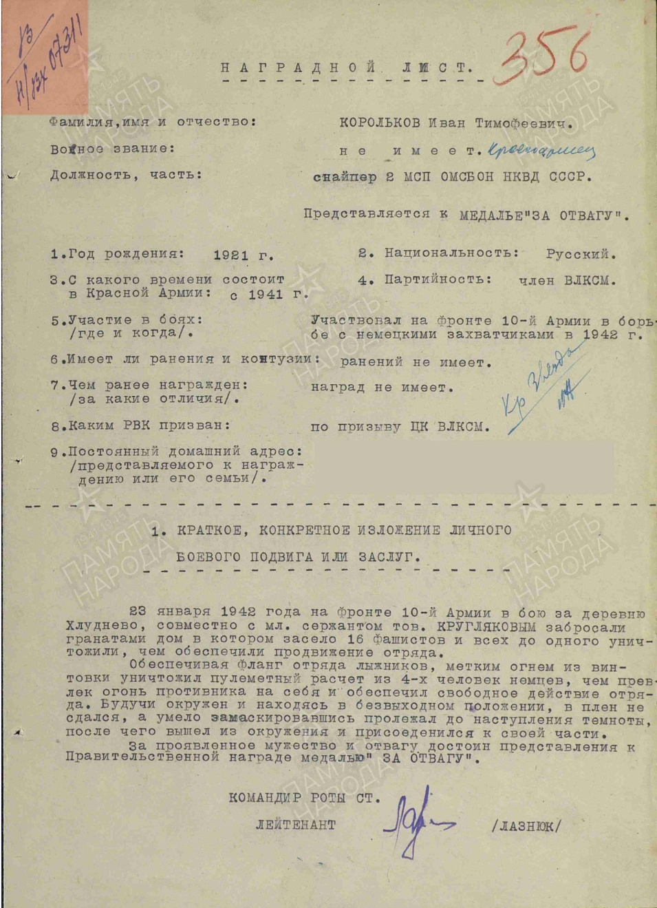 – Рус золдат, сдавайт! – снова послышались картавые выкрики фрицев.В это время в живых оставались Иван Корольков, Борис Перлин, Георгий Серяков, Иван Бойченко и заместитель политрука Лазарь Паперник, который, хоть и был ранен, принял на себя командование горсткой бойцов.В гитлеровцев полетела граната, прозвучало несколько одиночных выстрелов. На сарай с новой силой обрушился град пуль, засвистели мины. На этот раз ответных выстрелов не последовало…Гитлеровцы осмелели, поднялись во весь рост, начали приближаться к сараю. В это время в горящем проёме показался солдат.