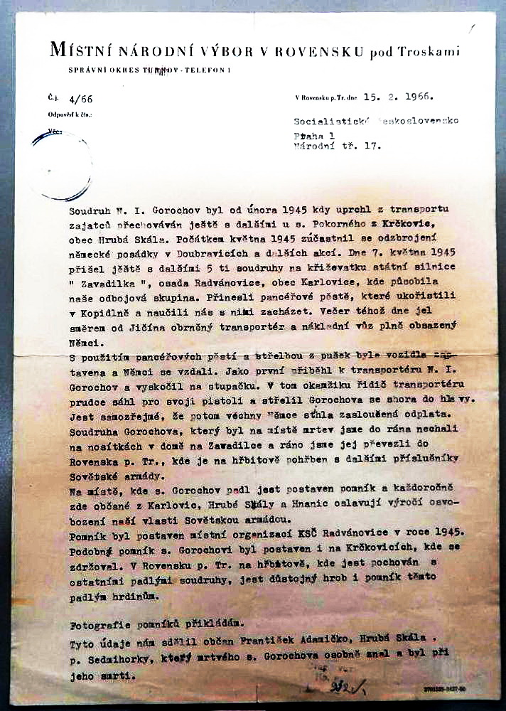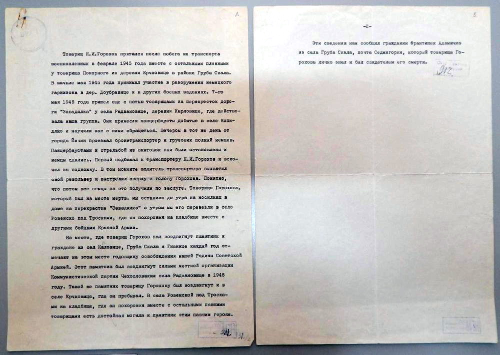 Воспоминания Франтишека Адамичко из села Груба Скала о последнем бое и гибели Горохова Н.И.