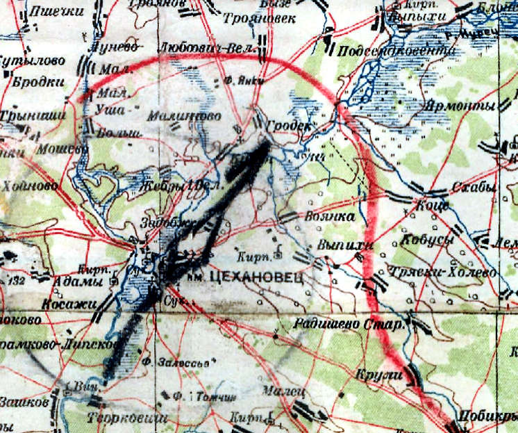В час ночи 22 июня штаб дивизии был поднят по тревоге. В 2-40 полки дивизии выступили на территорию участков обороны согласно плану прикрытия госграницы. Артиллерийские полки вышли из Червоного Бора для поддержки стрелковых полков. До выхода 113-й стрелковой дивизии для обороны участка в Цехановец для его прикрытия была оставлена полковая школа 330-го стрелкового полка с одной батареей[2]. 113-я стрелковая дивизия была рассеяна на марше в Цехановец. По одной из версий, в Цехановеце оборонялись полковая школа 330-го стрелкового полка, подразделения штаба дивизии и 96-й отдельный батальон связи. По другой версии, после артобстрела города, командование дивизии в панике покинуло город. Так или иначе, Цехановец был потерян в первый день войны, и вдоль левого фланга дивизии началось беспрепятственное наступление войск противника. В 8-00 330-й стрелковый полк вместе с разведбатом дивизии с ходу атаковал немецкие части в районе Даброво. Полк поддерживал артогнем 383 гап дивизии.