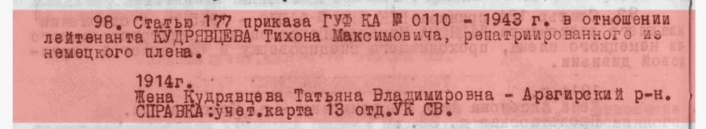 13 ноября 1945 года „бывший лейтенант" после фильтрации „пошёл куда-то" по 177 статье Приказа ГУФ КА от 1943 г.