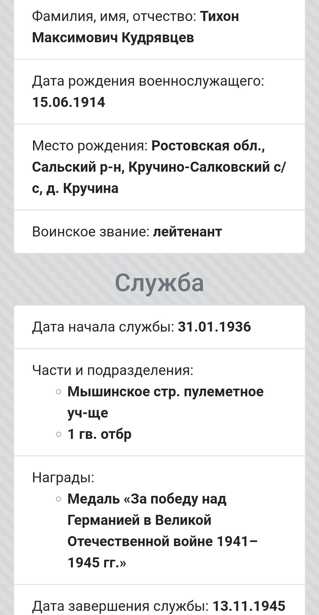 Тихон Максимович Кудрявцев в плен попал 18 февраля 1942 г., каторжничал на фашистов в силу обстоятельств в концлагере в Вязьме, в Витебске, затем с рабочей командой был перевезён в Шауляй, затем Хомниц; лишь 9 мая 1945 года его освободили из плена.