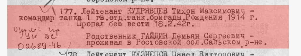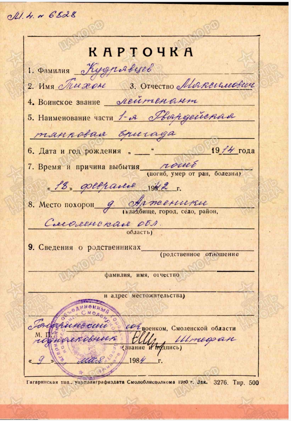 Жуткая судьба кадрового советского офицера Кудрявцева Тихона Максимовича, — возможно, это один из танкистов того горящего танка, зажатых заклинившим люком, кто подавал из Аржаников по рации сигнал о помощи, к кому вернулся экипаж Самойлова ( Погибшие танкисты, д. Аржаникии Смоленская об. , но в силу обстоятельств не сумел помочь), вынужденно пожертвовав своими жизнями..