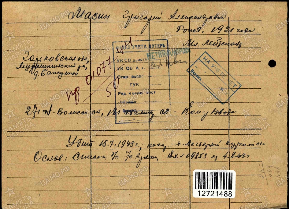 Командир 2 взвода 2 роты 271 сп 181 сд мл. лейтенант Мазин Григорий Александрович 1920-1921 г р, урож. Б-Мурашкинского р-на д. Бажулино, призванный Б-Мурашкинским РВК Горьковской обл. в сентябре 1940 г., награждён Медалью За Отвагу за бой 25.03.1943 г., погиб 15.07.1943 г. п. Дегтярный Курской обл.