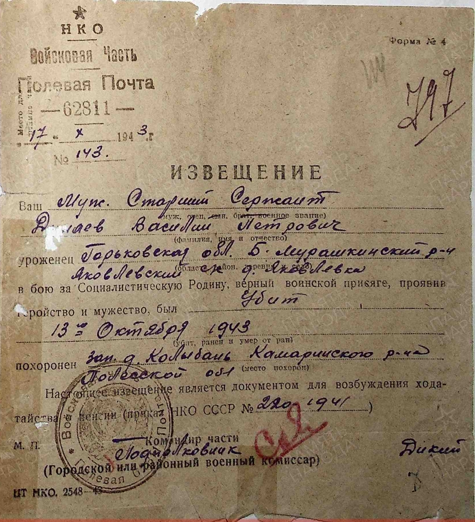 Ст. сержант Дунаев Василий Петрович, урож. Больше-Мурашкинского р-н, Яковлевского с/с, д. Яковлевка, погиб 13.10.1943 - Ссылка