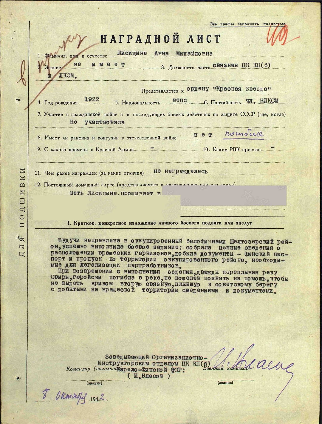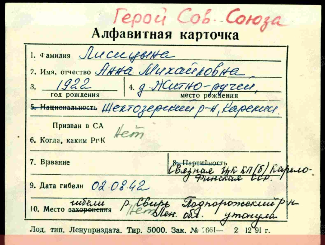 Родилась в 1922 году в деревне Житноручей (ныне в составе села Рыбрека Прионежского района Карелии). По национальности вепсянка. Окончила среднюю школу в селе Рыбрека. В 19381940 годах училась в Ленинградском библиотечном техникуме (или в Карельском училище культуры), по окончании которого работала библиотекарем в Сегежском районном клубе. В июне 1942 года Анна Лисицына и Мария Мелентьева были направлены в оккупированный финнами Шелтозёрский район. Они организовали там явки для подпольных комитетов, собрали сведения об оккупационном режиме, расположении огневых точек и оборонительных сооружениях противника и установили контакт с населением. Пробыв в Шелтозерском районе в течение месяца, ежечасно рискуя жизнью, Лисицына и Мелентьева полностью выполнили боевое задание. Возвращаясь с выполнения боевого задания, Мелентьева и Лисицына по пути к линии фронта должны были переправиться через реку Свирь, к которой они подошли 2 августа 1942г. Весь день мастерили плот и в 1 час ночи 3 августа начали на нем форсировать реку. На середине реки плот стал рассыпаться. Девушки решили преодолеть остальную часть реки вплавь. Завязав документы на голове, они бросились в реку. Вода была очень холодной. Недалеко от берега Анна Лисицына почувствовала, как ноги ее начали сводить судороги и до берега ей не доплыть. Из создавшегося положения было два выхода: или закричать, тогда с берега на лодках подплывут неприятельские солдаты, спасут ее и заберут, или, пожертвовав своей жизнью, спасти документы и подругу, дав ей возможность уйти к своим. Для героической патриотки выбор был ясен. Захлебываясь, она сказала Мелентьевой, что не доплывет до берега, утонет и что в эту минуту "больше всего на свете боится, чтобы не закричать". Успев передать Мелентьевой документы, прикусив себе руку, чтобы не вскрикнуть, не издав ни звука, Лисицына скрылась под водой. Мелентьевой не удалось ее спасти. Оставшись одна, Мелентьева с трудом добралась до берега, затем прошла еще 23 км по местности, занятой войсками противника. Только на шестые сутки девушка вышла в расположение 276-й стрелковой дивизии 7-й Армии и доложила ЦК КП(б) о выполнении боевого задания, рассказав о том, что при возвращении c задания Анна Лисицына погибла при переправе через реку Свирь, успев передать ей собранные разведданные. Анна Лисицина является подлинной героиней советского народа.Указом Президиума Верховного Совета СССР от 25 сентября 1943 года за образцовое выполнение боевых заданий командования и проявленные мужество и героизм в боях с немецко-фашистскими захватчиками Лисицыной Анне Михайловне посмертно присвоено звание Героя Советского Союза.