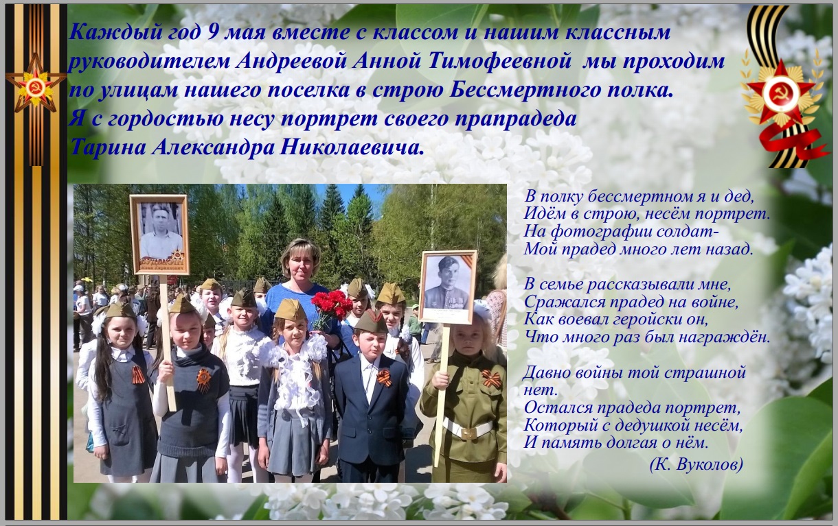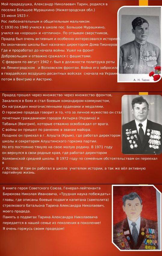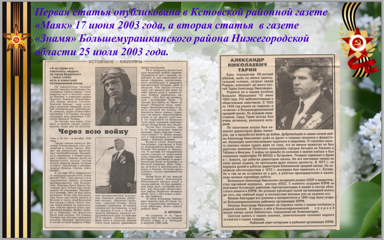 Сотрудница Княгининского объединенного военкомата В.Н. Шмелева, к которому сейчас относится Б-Мурашкинский район, предположила, что, возможно, А.Н.Тарин служил по линии госбезопасности, и советовала обратиться в отдел ФСБ по Нижегородской области.