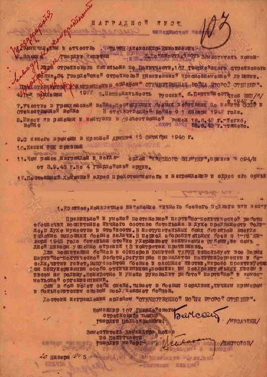 Из Книги Героя СССР Генерал-лейтенанта Бирюкова Н.И. "Трудная наука побеждать" на 6-й странице есть эпизод о капитане (замполите) стрелкового батальона Тарине из 29-й гв. ВДД - https://www.litmir.me/br/?b=94363&p=1 :